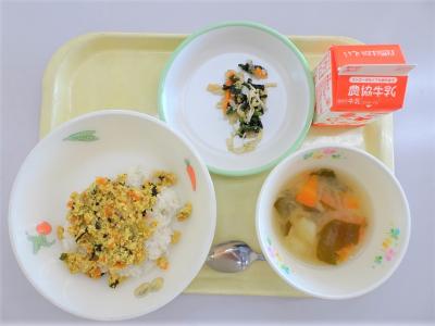 カレーそぼろごはん、五目なます、みそ汁、牛乳