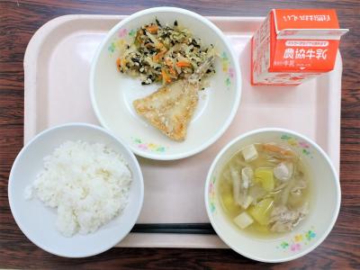 ごはん、ハタハタのいしる風味揚げ、切干のピリ辛炒め、めった汁、牛乳