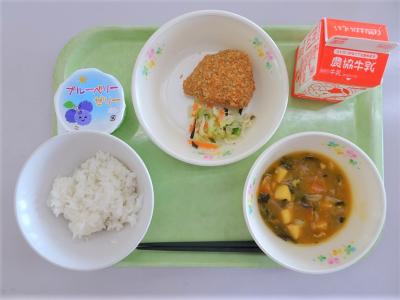 ごはん、かぼちゃひき肉フライ、中華和え、豆腐のカレー煮、ブルーベリーゼリー、牛乳