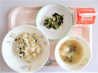 小松菜とひき肉のチャーハン、チョレギサラダ、中華スープ、牛乳