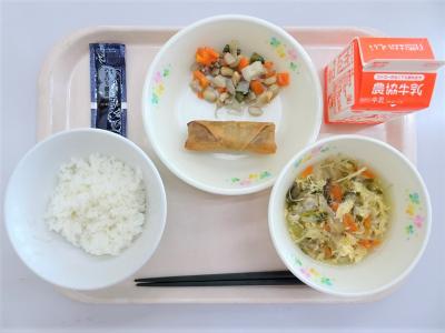 ごはん、揚げハルマキ、五目豆、サンラータン、のりの佃煮、牛乳