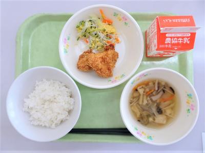 ごはん、チキンカツ、バンサンスー、きのこ汁、牛乳