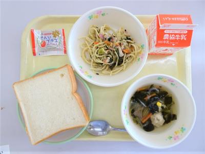 ミルク食パン、和風スパゲティ、ミートボールスープ、りんごジャム、牛乳