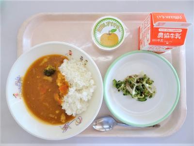 チキンカレー、きゅうりの梅おかかあえ、加賀しずくゼリー、牛乳