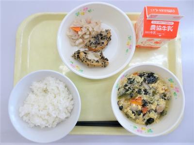 ごはん、鶏肉のごま味噌焼き、いそべあえ、すまし汁、牛乳