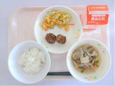 ごはん、れんこん入り肉団子の照り焼き風、小松菜の煮びたし、とり野菜、牛乳