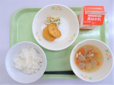 ごはん(ひゃくまん穀)、魚のゆずあんかけ、糸寒天サラダ、かぼちゃと里芋のそぼろ煮、牛乳