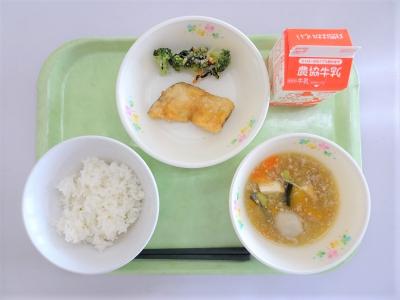 小豆ごはん、ぶりのいしる風味揚げ、あいまぜ、みそ汁、牛乳