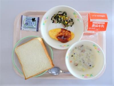 はいが食パン、鶏肉のマーマレード焼き、切干のアラビアータ風、根菜のカレーチャウダー、スライスチーズ、牛乳