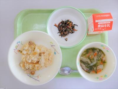 キムタクごはん、きくらげの彩り炒め、ワンタンスープ、牛乳