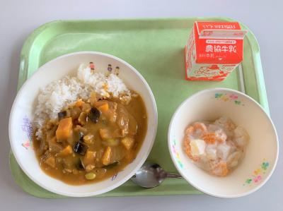 夏野菜カレー、フルーツのヨーグルト和え、牛乳