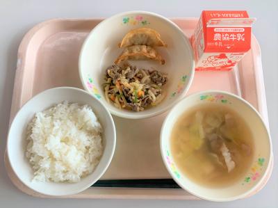 ごはん、揚げギョウザ、チンジャオロースー、中華スープ、牛乳