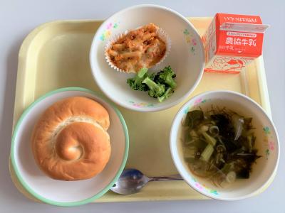 ミルクロール、ラザニア風、ゆでブロッコリー、もずくスープ、牛乳