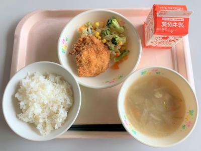ごはん、チキンカツ、ブロッコリーサラダ、みそけんちん汁、牛乳
