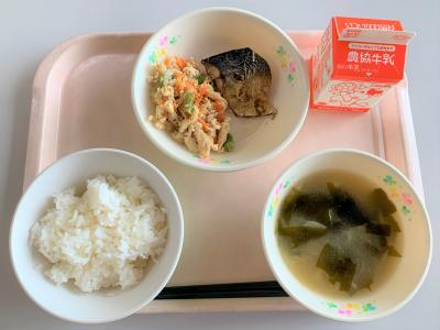 ごはん、サバのソース煮、炒り豆腐、みそ汁、牛乳