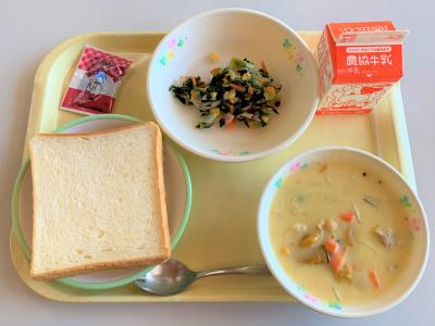食パン、かぼちゃシチュー、小松菜のソテー、豆チョコクリーム、牛乳