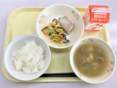 ごはん、豚肉の糀焼き、野菜の塩こんぶ和え、つみれ汁、牛乳