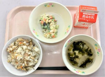 ツナごはん、すまし汁、ビーンズサラダ(石川県産発芽大豆使用)、牛乳