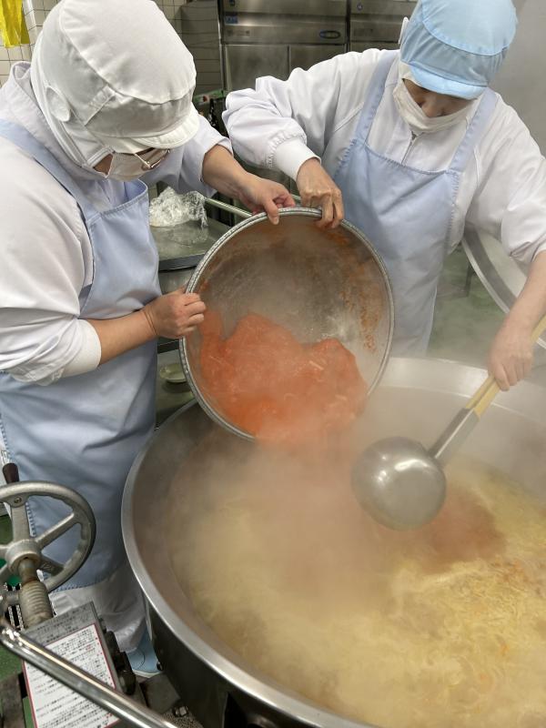 調理員さんたちは、混ぜた後のことを考えて味付けしています。旬の食べものはおいしいですね!