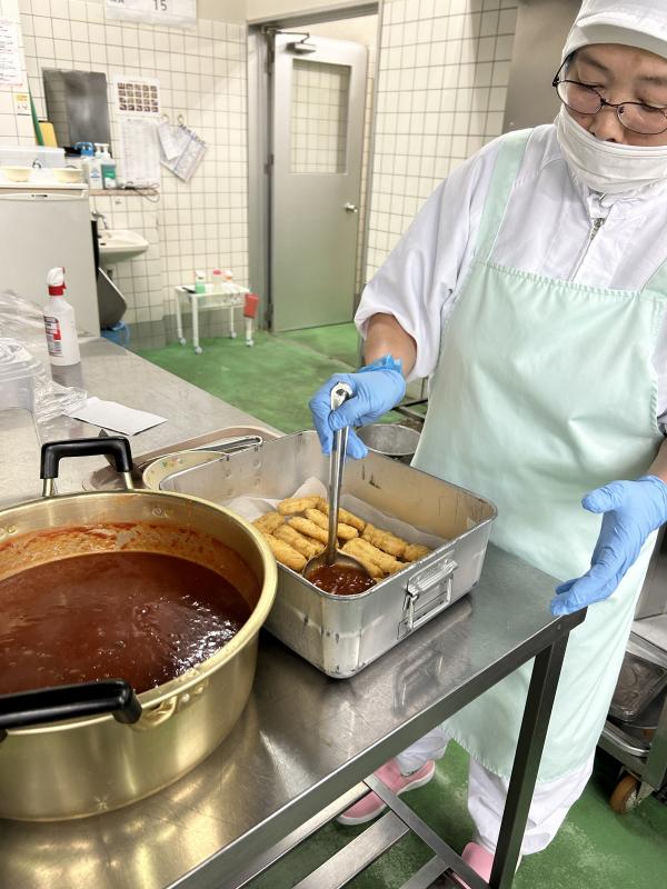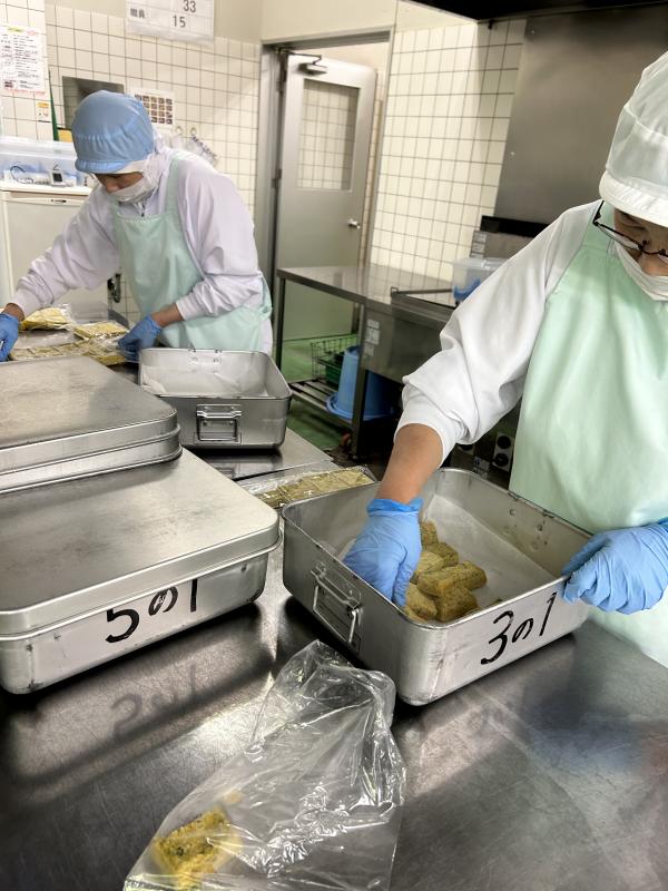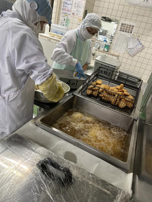 今日の主菜は久しぶりの登場の「エビカツ」です。中にプリっとしたえびがたっぷり入ったフライです。しっかりめの味付けで、ソースがなくてもおいしくいただけました。調理員さんたちは、しっかり温度を確認して揚げ、数に間違いのないよう2人で数えます。