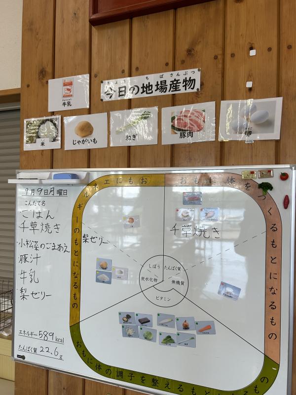 「千草焼き」とは、たくさんの具を使った卵焼きのことです。ほうれん草やにんじんなどが入った彩りのよい卵焼きでした。この卵焼きは、穴水町に工場のある業者さんから仕入れました。ランチルームには、給食で使用した地場産物がわかるように毎日掲示しています。今日は、米・牛乳・豚肉・卵・じゃがいも・ねぎが地場産物でした。