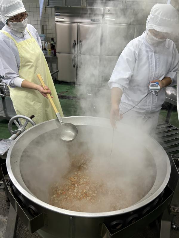 具は混ぜることを考えて少し濃いめの味付けにしています。調理場で炊いた炊き立てのご飯はやっぱりおいしいです!