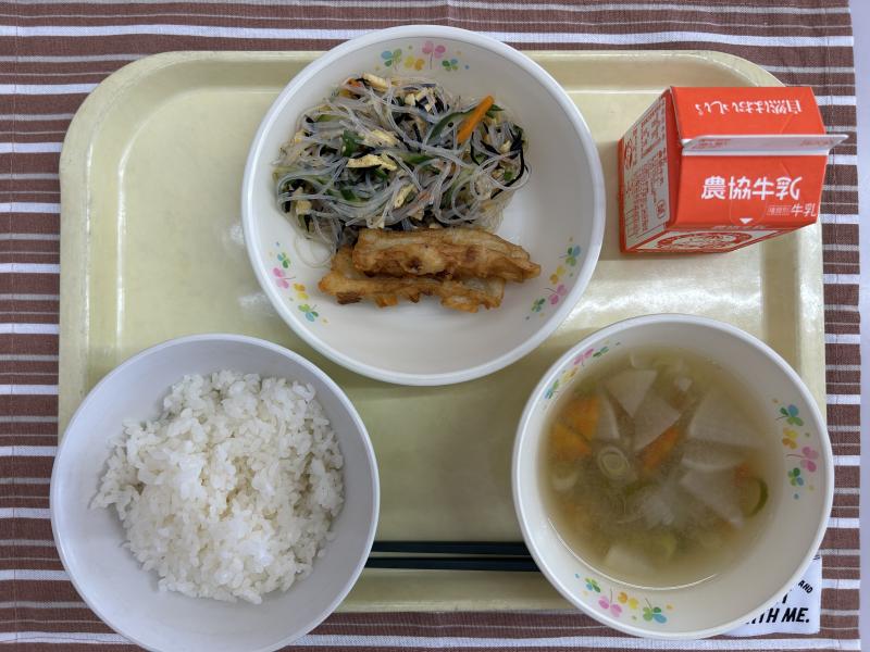 今日の主菜は「鶏肉の竜田揚げ」です。しょうがや醤油、酒で下味をつけた鶏肉に、1つ1つ丁寧に米粉と片栗粉をつけ揚げました。子どもたちにも大人気で、今日はみんな食べ終わるのが早かったです。
