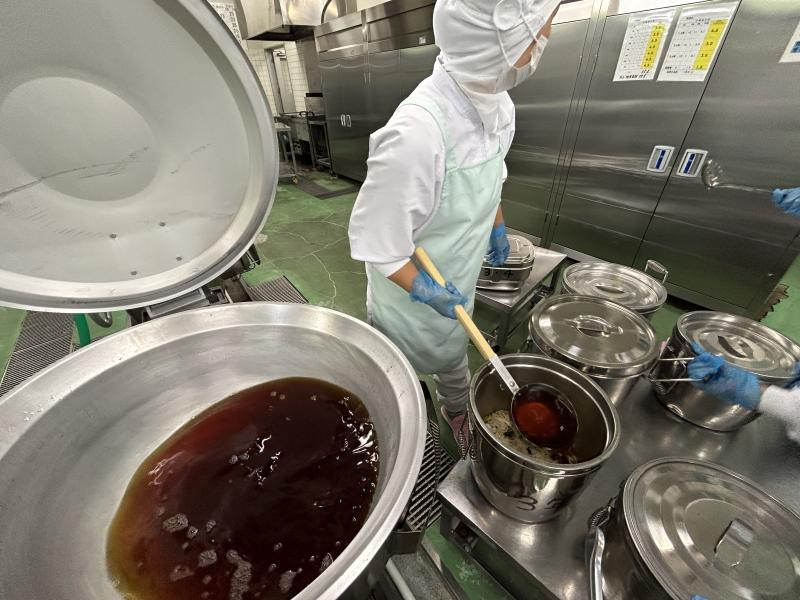 給食の混ぜごはんは、具を別に炊き、昆布や淡口しょうゆを入れて炊いたごはんと合わせて作ります。