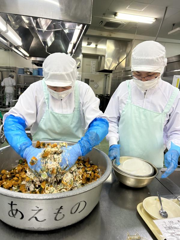 おもてなしのための、ご馳走は、山や田でとれた、さといも、きのこ、たいこん、にんじん、豆などと使って料理します。魚は本来尾頭付きを使いますが、給食では、地元のふくらぎを使いました。