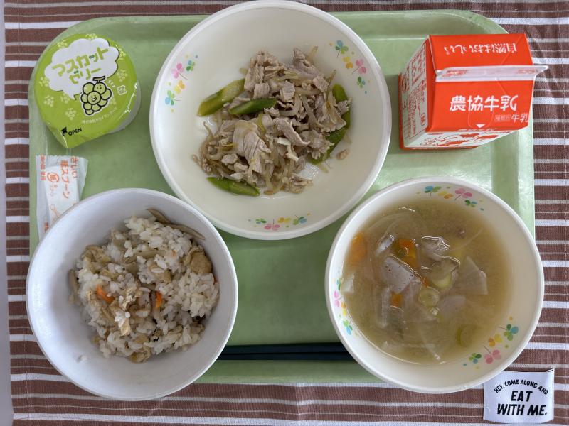 今日の給食は、穴水中学校の1年1組の澤田さんが考えた献立です。アスパラの肉巻きともやしとわかめのサラダを考えてくれましたが、調理場の都合で炒め物にアレンジして提供しました。