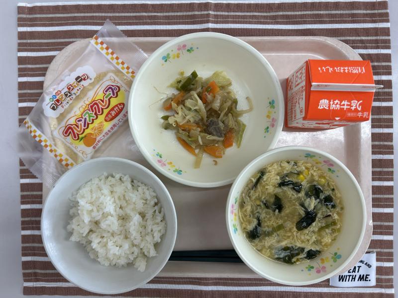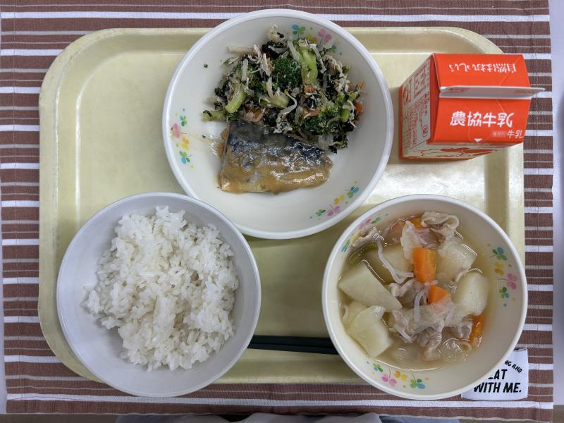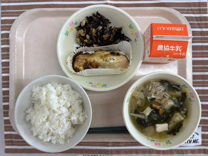 ※さばのしょうがみそ焼きの予定でしたが、仕上がったものを味見した際に異臭があり、子どもたちに提供できないと判断しました。急遽、明日使用予定だったミートオムレツを提供しました。