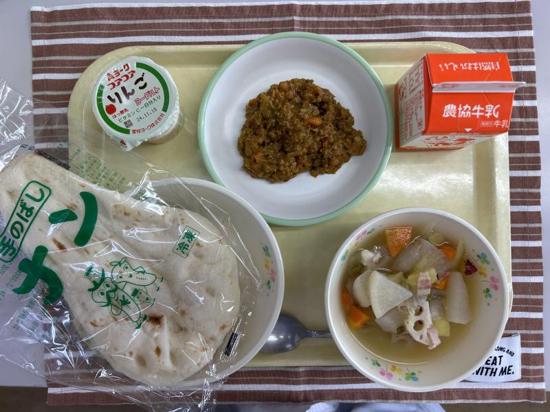 今日は月に2回のパンの日です。今日は「ナン」を提供しました。ほとんどの児童がナンが初めてだったようで、
