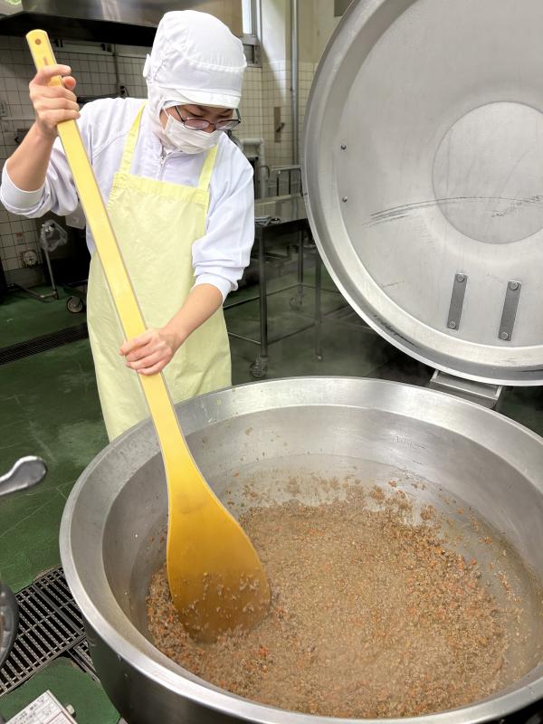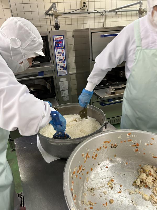 給食のちらしずしは、日本酒と昆布を入れて、かために炊いたごはんに、すし酢をいれて、別で炊いた具を混ぜ込んで作ります。手間のかかる作業ですが、調理員さんたちはおいしく仕上げるために丁寧に作業してくれています。