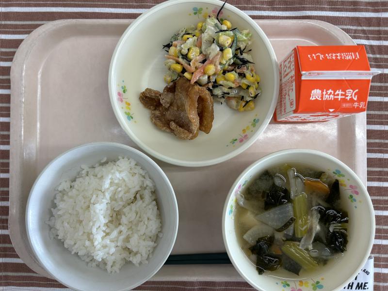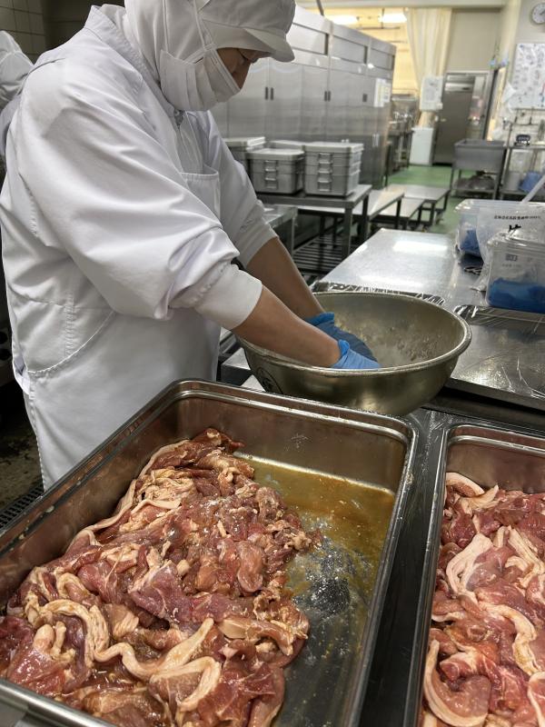 今日の主菜は「豚肉のくわ焼き」です。「くわ焼き」とは、昔畑仕事で使っている鍬で野生の動物を焼いて食べたのが始まりだそうです。給食では、豚肉に下味をつけ、片栗粉と米粉を合わせた衣をつけ揚げます。それに甘辛いタレをかけて仕上げました。