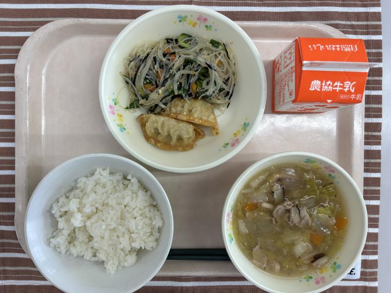 今日の汁物は「担々麺」です。先月巡回校の児童から「ラーメン食べたい」とリクエストがあったので入れてみました。肉みそを作り、野菜を煮込んでスープを作ります。麺は茹でて、スープとは別で配缶します。そうすることによって、麺がのびずに食べられます。麺が多いかなと心配しましたが、みんなおいしいと食べてくれました。