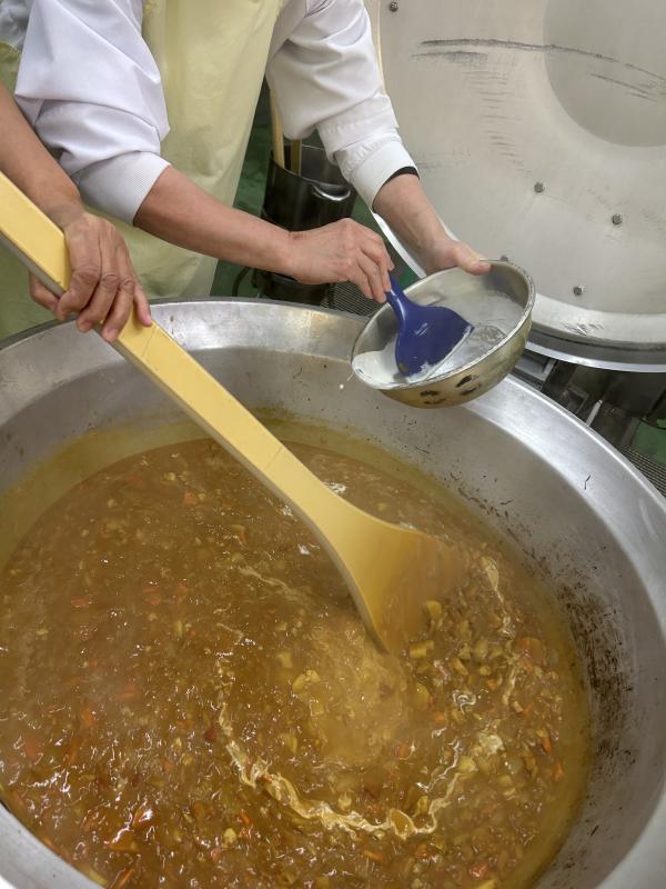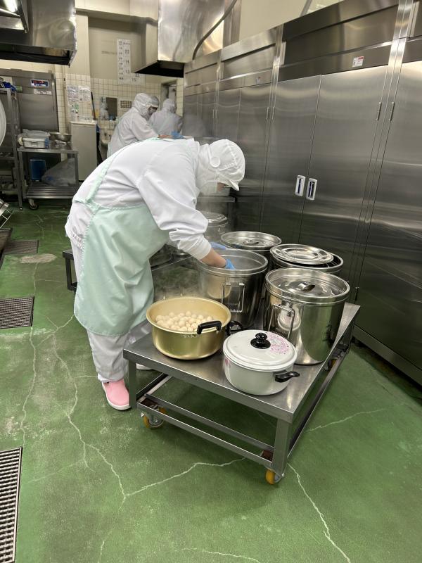 今日の汁物は八宝菜です。しょうがやにんにくを炒めて香りを出し、はくさいやにんじん、豚肉、いかなどを煮込みとろみをつけて仕上げます。うずらの卵は1人1個はあたるように調理員さんが数を数えて食缶に入れてくれています。別のなべで煮て下味をつけているのて味がしみいました。今日は急に寒くなったので、とろみついた八宝菜で温まりました。