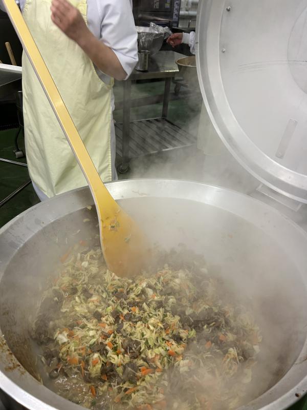 今日は初めてのメニューの「ジンギスカン」を提供しました。北海道滝川市のB&G財団様からの支援物資です。