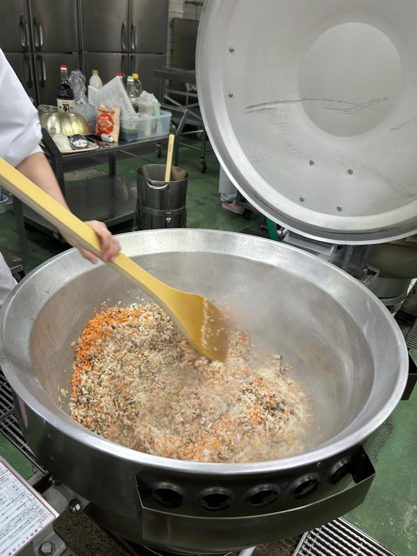 今日は先月提供できなかった「秋を感じる丸ちゃん給食」の主食の「炊き込みごはん」です。調理場の都合で、丸山さんが考えた献立通りにできなかったので、今日提供しました。