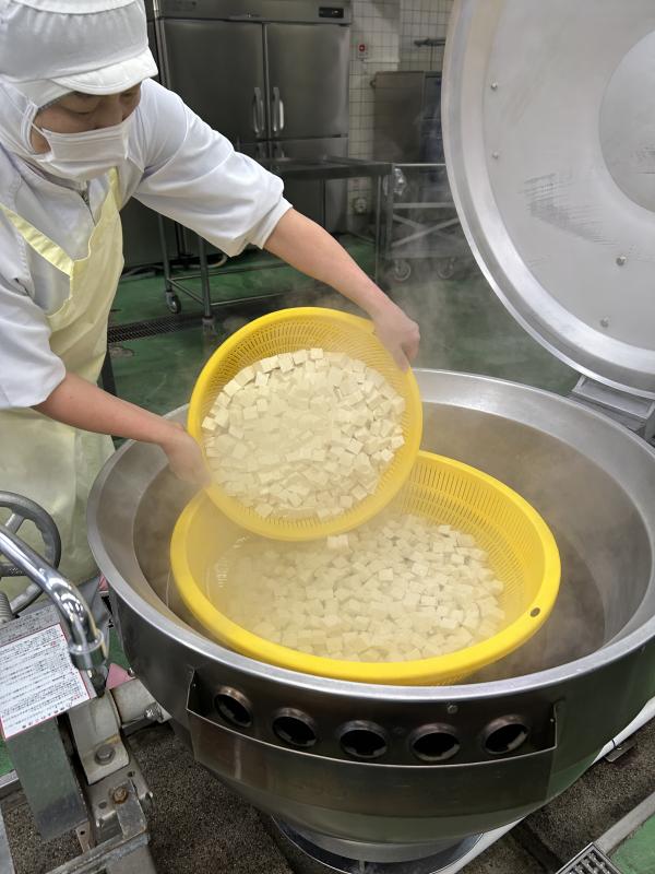 今日の汁物は、「麻婆豆腐」です。給食の麻婆豆腐は、具がたっぷり!たまねぎ、にんじん、しいたけ、ねぎ、にら、豚肉が入っています。にんにくやぎょうが、トウバンジャンを炒め、赤みそで調味します。水っぽくならないように仕上げるために豆腐は別の釜で茹でてから加えます。