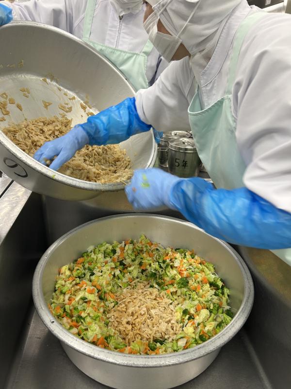 今日の副菜は「くきわかめのあえもの」です。こりこりした食感が特徴のくきわかめと野菜を白みそやコチュジャンなどで作った調味料で和えました。さっぱりした味で食べやすかったのですが、子どもたちはくきわかめが苦手な子が多かったです
