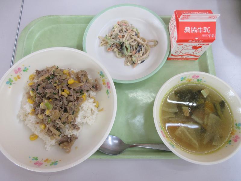 今日の給食は新メニューの「ビーフペッパーライス」です。甘辛い牛肉とコーン、青ねぎをオイスターソースやあらびきこしょう、バターなどで調味し、コンソメライスの上にかけて食べます。