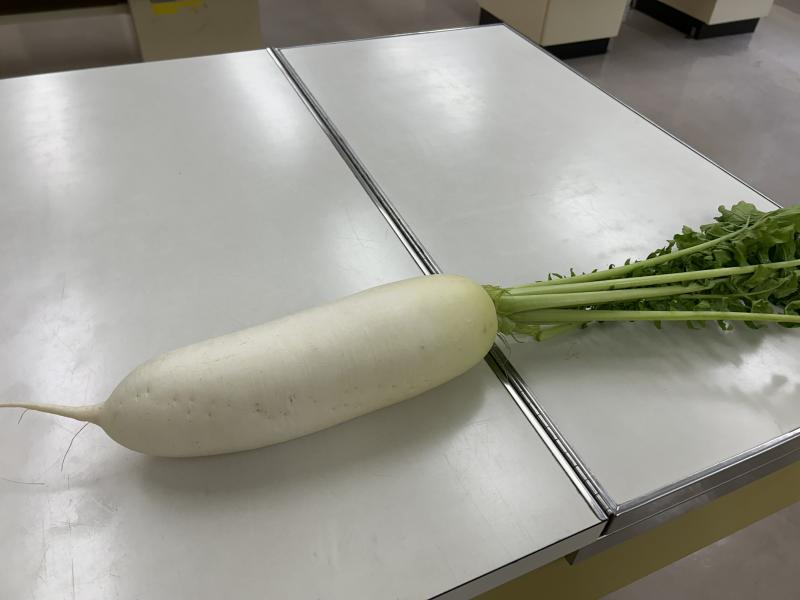 今日の汁ものは「大根のそぼろ煮」です。今日給食で使った大根は、2年生が生活科でお世話になった大隅さんが育てた大根です。「おでん大根」という品種で、大きくて味染みがよく、早く煮えるのが特徴です。