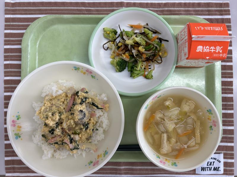 1本2㎏近くもある立派な大根が届きました。葉っぱもきれいなので、そぼろ煮の彩りに使いました。調理員さんたちは、せっかくのきれいな葉っぱなので、色が変わらないように別のなべでゆで、食缶に入れるという手間をかけてくれました。給食時間に子どもたちに紹介し、みんなでおいしくいただきました(^^)