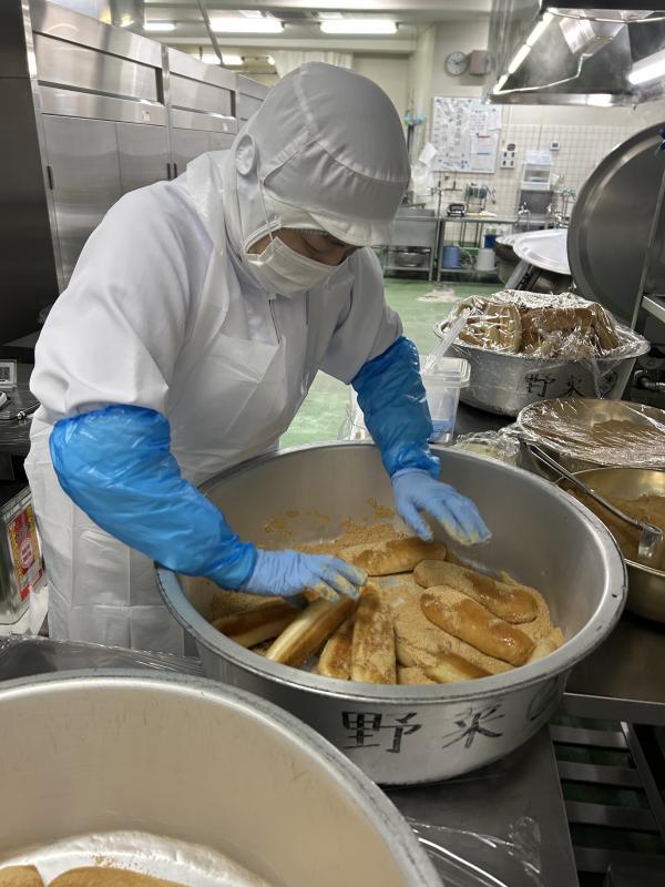 今日はみんなが待ちに待った「きなこ揚げパン」です。穴水町は冷凍のパンを使っているので、個包装の袋を開けるところから始まります。高温の油でサッと揚げるのがポイントです。みんな口のまわりをきなこだらけにしながら、頬張っていました。