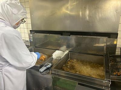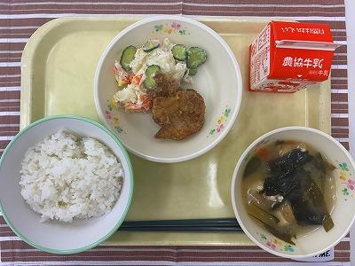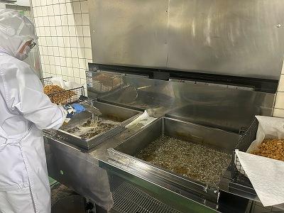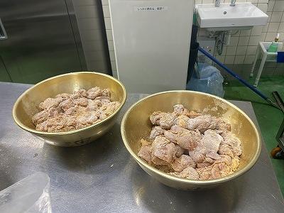今日は、みんな大好きから揚げです。しょうゆや酒、しょうがで下味をつけた鶏肉に片栗粉と米粉を合わせた衣をつけ揚げます。特別な材料は使っていませんが、給食のからあげはやっぱりおいしいですね!