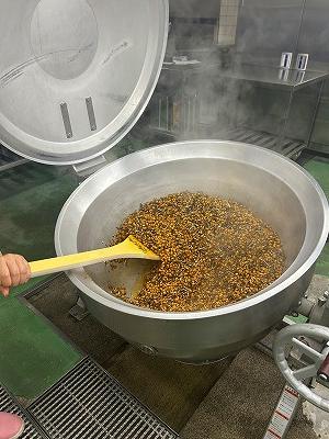 今日は、「大豆と煮干しのごまがらめ」です。大豆は水戻しして、片栗粉をつけ揚げます。煮干しは素揚げにし、しょうゆやさとうで作った調味料とごまをからめます。よく噛むメニューです。