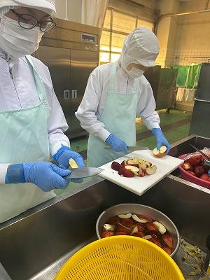 りんごは能登町の「秋茜」という品種の物が届きました。給食では、しっかり噛んでもらえるように皮付のまま提供します。