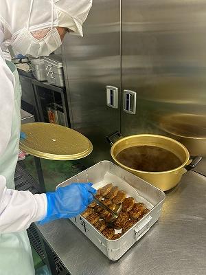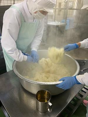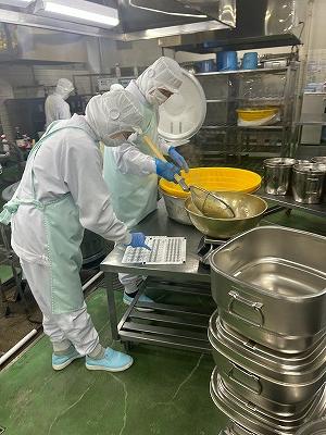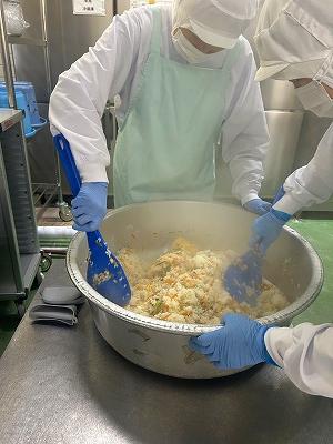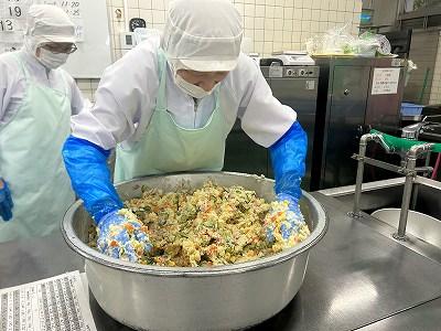 副菜は、ポテトサラダです。じゃがいもが重いので混ぜるのが大変です。調理員さんは、手袋を使って体全体で混ぜています。