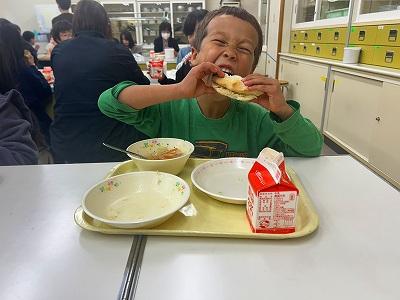 今日は、月に2回のパンの日です。今日は、ハンバーグを自分ではさんで食べるセルフハンバーグです。1年生も上手に自分ではさんで食べていました(^▽^)