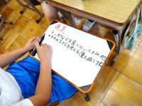 始めに、自分の名前の文字を使って作った楽しい自己紹介文が発表されました。そして、野菜作り名人の勝井さん・高森さんから教えていただいたミニトマトのつくり方などのクイズがありました。